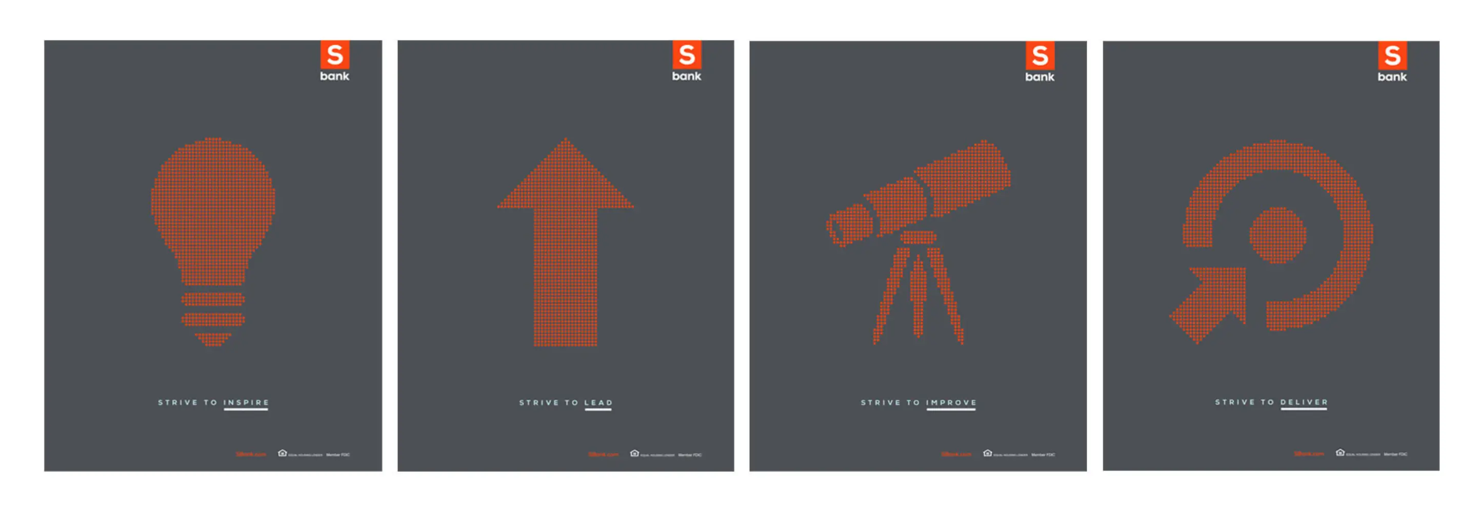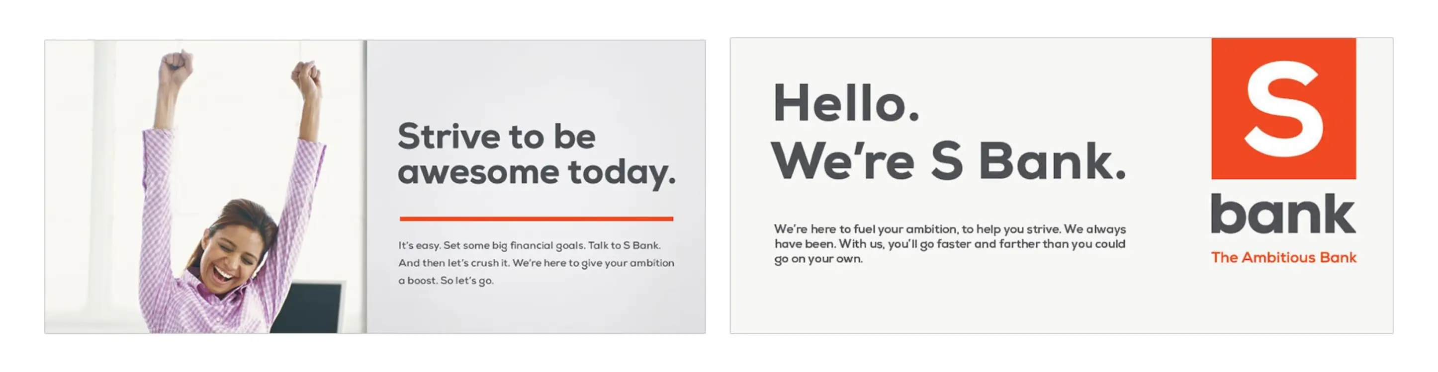 We created a comprehensive system for the bank that elevated the “S” into a true brand. The name “S Bank” now refers to their ambitious nature to always “strive” to achieve customers’ goals. We kicked off the branding promotion with a simple introduction: “Hello. We’re S Bank.” The subsequent branding materials created a visual language and clarity of communication that helped S Bank regain traction, market share and unity within the team.